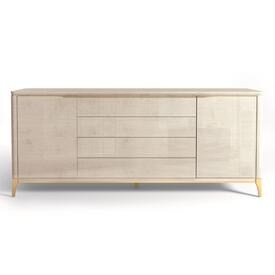Dos puertas con cierre retardado y estantes en el interior. Cuatro cajones centrales. El cajón superior con cierre retardado. Los tres cajones inferiores con sistema push. Tapa de madera. Base con patas de latón.
