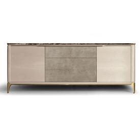 El aparador Soho tiene un diseño funcional pero lleno de connotaciones lujosas, que se reafirman en el glamour con tapas de mármol o madera y frentes en piel o madera, así como tiradores y bases de latón.